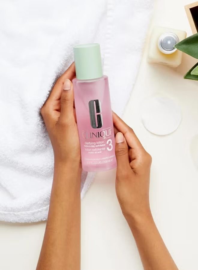 بعد از شستشوی صورت، مقداری از Clinique Clarifying Lotion 3 را روی یک پد پنبهای بریز و با حرکات ملایم روی پوست صورت و گردن بکش. از تماس مستقیم با ناحیه چشم خودداری کن. سپس از مرطوبکننده مناسب استفاده کن. برای بهترین نتیجه، دو بار در روز (صبح و شب) استفاده شود.