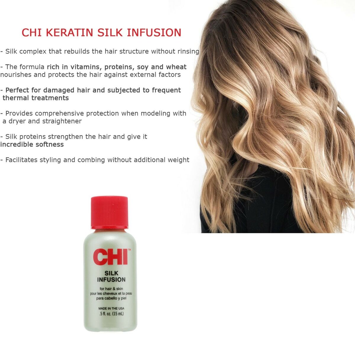 CHI Silk Infusion (نسخه Infra/تعمیرکننده) یک سرم لِیو-این (بدون آبکشی) قدرتمند برای ترمیم، درخشش و نرمی موها است. این محصول بهویژه برای موهای خشک، آسیبدیده، وز و رنگشده مناسب است. فرمول بدون الکل، سولفات، پارابن و گلوتن دارد و توسط برند CHI عرضه میشود .